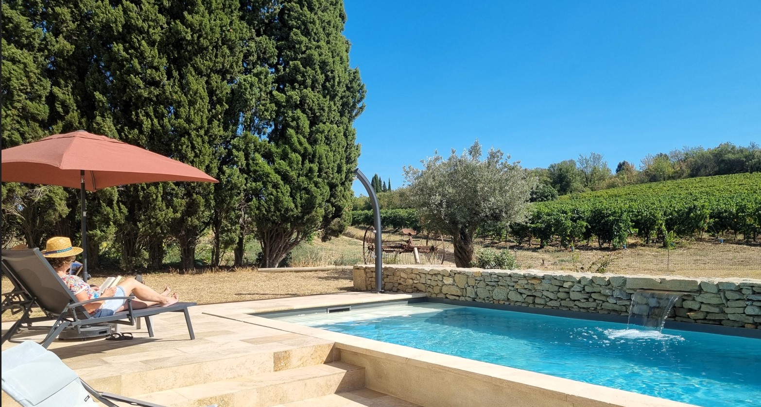 La piscine est privative et attenante à la maison par la terrasse pavée de travertin. Elle occupe la façade sud.